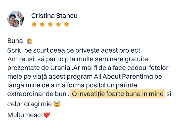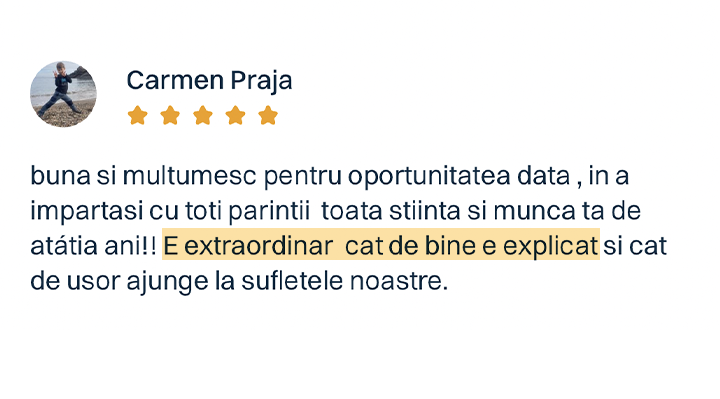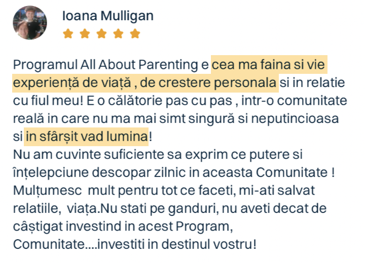 Fizic, în sală, sau online, în webinarii și cursuri, toate aceste soluții au ajutat numeroase familii să aibă mai multă liniște în casă și în relația cu minunile lor. Primesc zilnic mesaje de mulțumire și testimoniale emoționante despre cum viața de părinte nu mai arată ca un câmp de luptă, ci ca o călătorie cu suișuri și coborâșuri – dar fără pedepse și recompense.