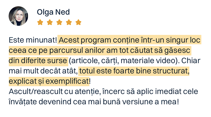 Ce îl face cu adevărat diferit? Oferă tehnici clare, aplicabile imediat, nu doar concepte abstracte. Și, poate cel mai important, nu ești singur în această călătorie: primești sprijin constant, răspunsuri personalizate și încurajare exact când ai nevoie.