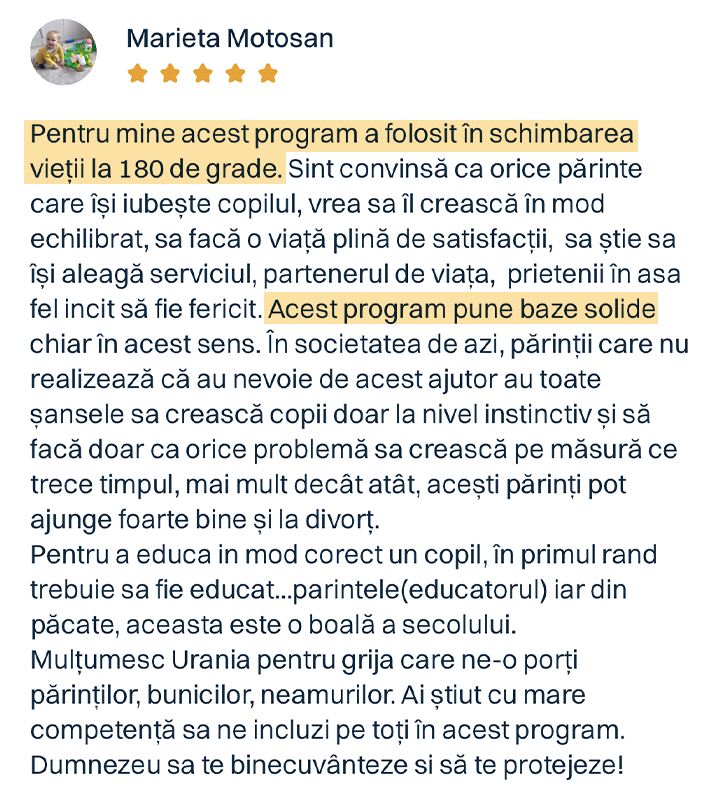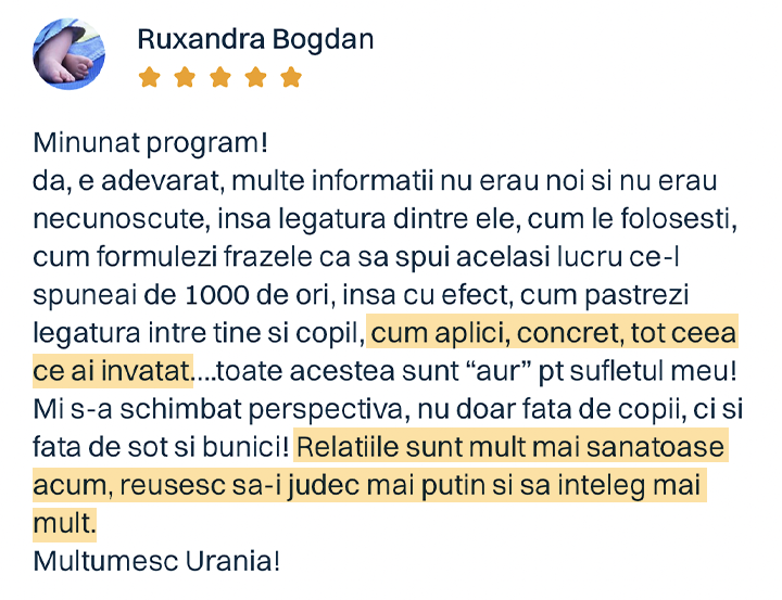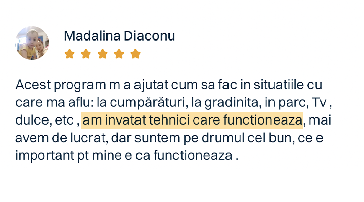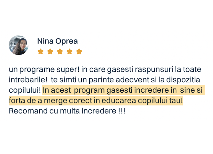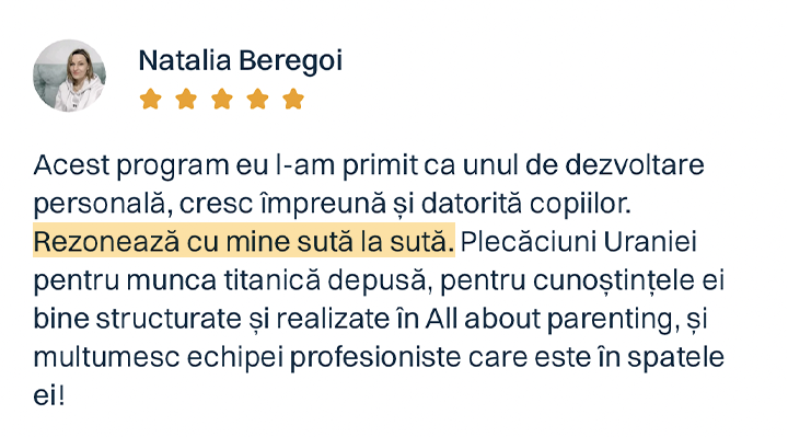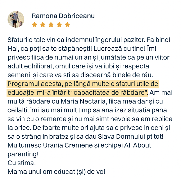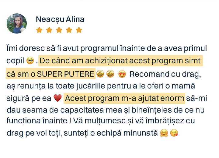 Și da, programul funcționează chiar și dacă doar un părinte îl aplică. Pentru că relația copilului cu fiecare dintre voi este unică. Iar impactul pe care îl ai tu, zi de zi, în dezvoltarea armonioasă a copilului tău… este uriaș.