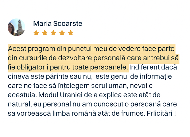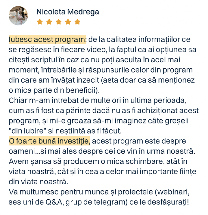 Odată ce ai achiziționat programul, ai acces pe viață la conținutul video și materialele incluse. Asta înseamnă că nu există niciun termen limită, nicio presiune de timp, deci poți reveni oricând, în ritmul tău, ori de câte ori simți nevoia să reiei informația sau să aprofundezi o temă care devine relevantă pe măsură ce copilul tău crește.