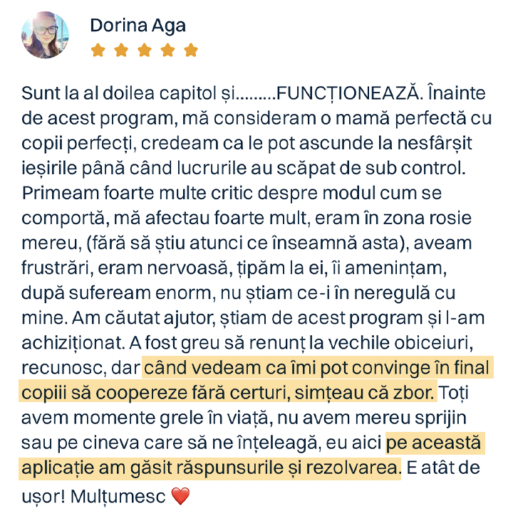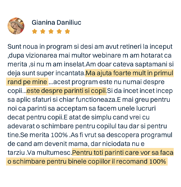 Urmărește materialele, aplică primele tehnici și vezi cum funcționează în familia ta. Dacă simți că programul nu ți se potrivește, ne spui și îți returnăm banii, fără întrebări, fără complicații. E simplu: tu decizi dacă merită să continui, fără niciun risc.