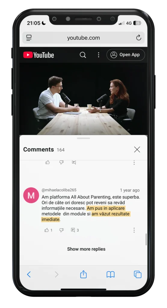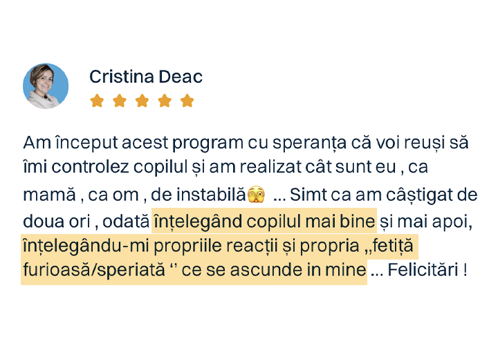 Ce am observat de-a lungul anilor este că atunci când încep să apară rezultatele (mai puține certuri și lupte de putere, mai multă cooperare, mai multă liniște în casă) și celălalt părinte devine curios să aplice. Așa începe să se schimbe dinamica nu doar între voi și copil, ci chiar între voi doi ca parteneri. Uneori, schimbarea unui om schimbă o întreagă familie.