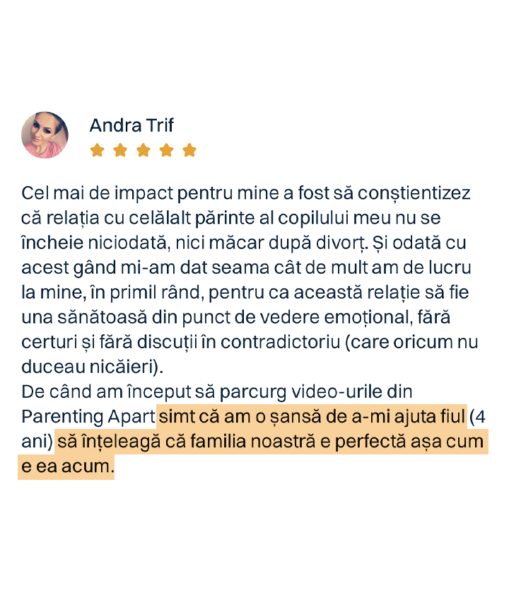 Parenting Apart nu este doar despre „după separare”, ci și despre a preveni conflictele inutile, a gestiona tranzițiile cu mai puțin stres și a înțelege cum să protejezi relația cu copilul, indiferent ce se întâmplă în cuplu.
